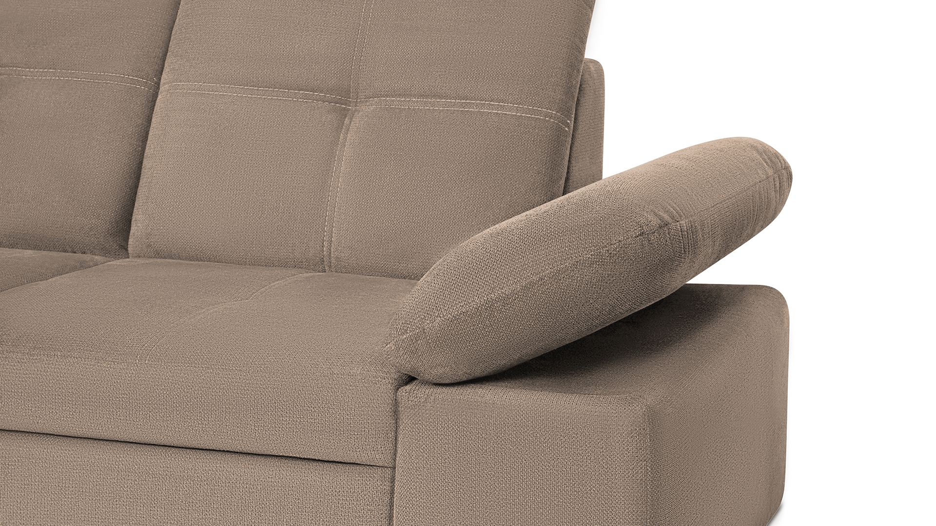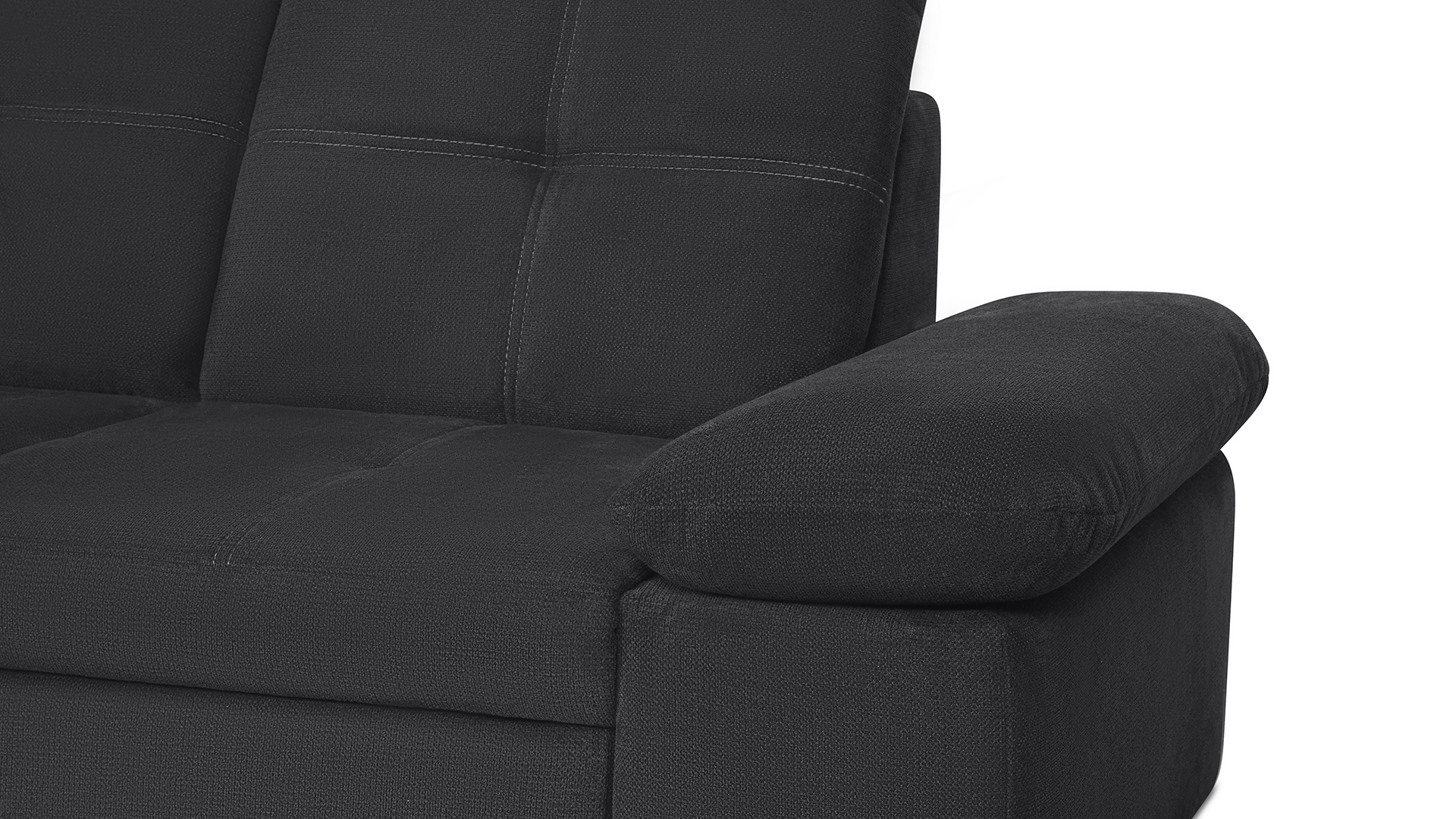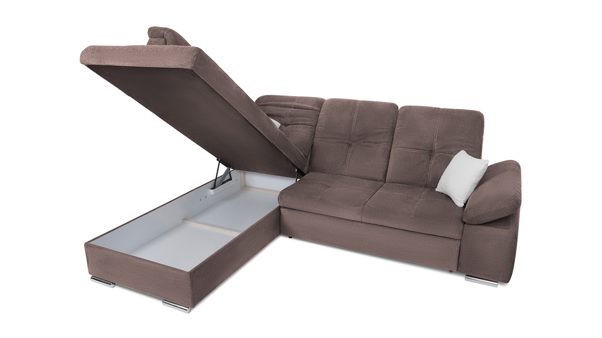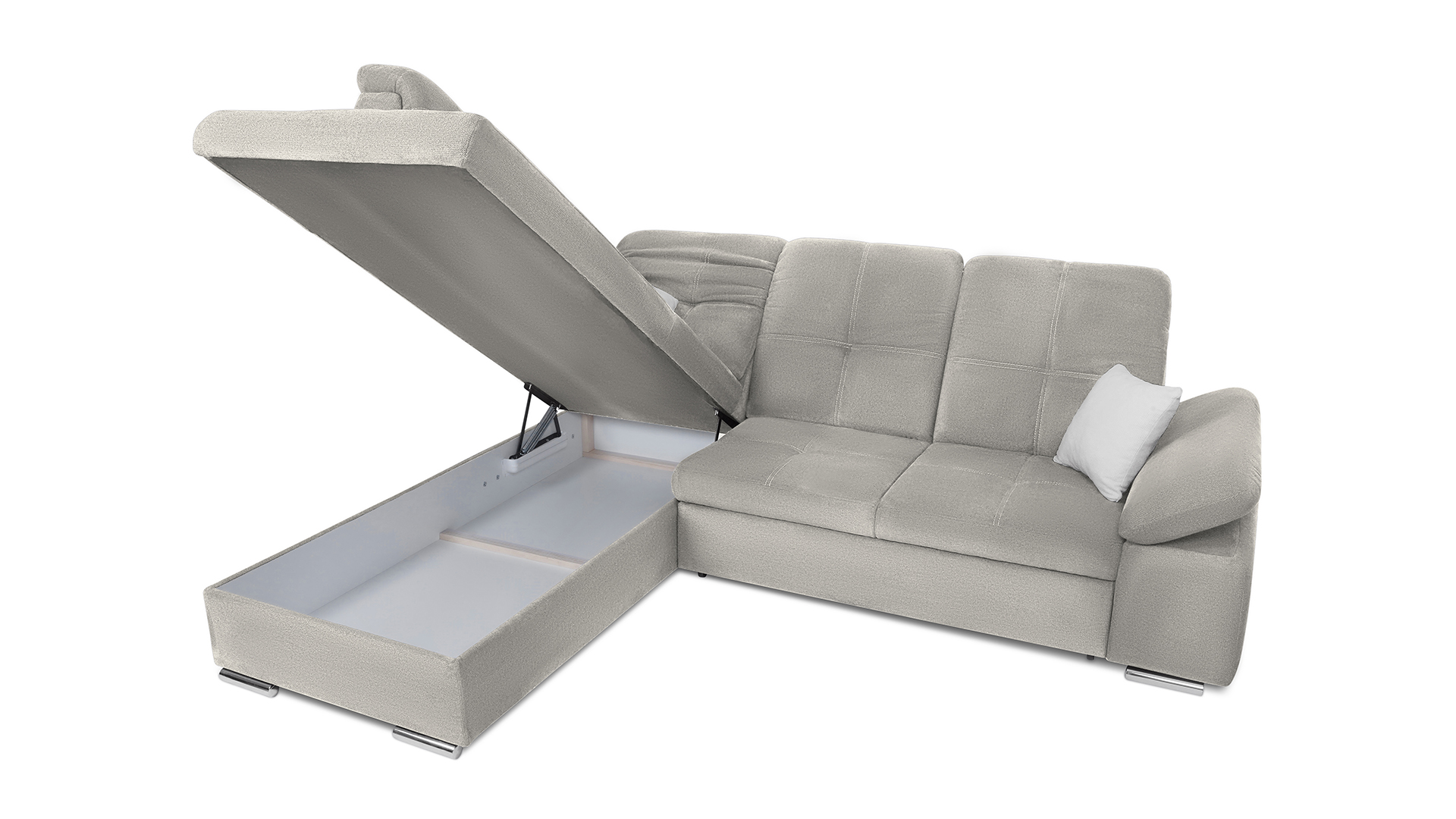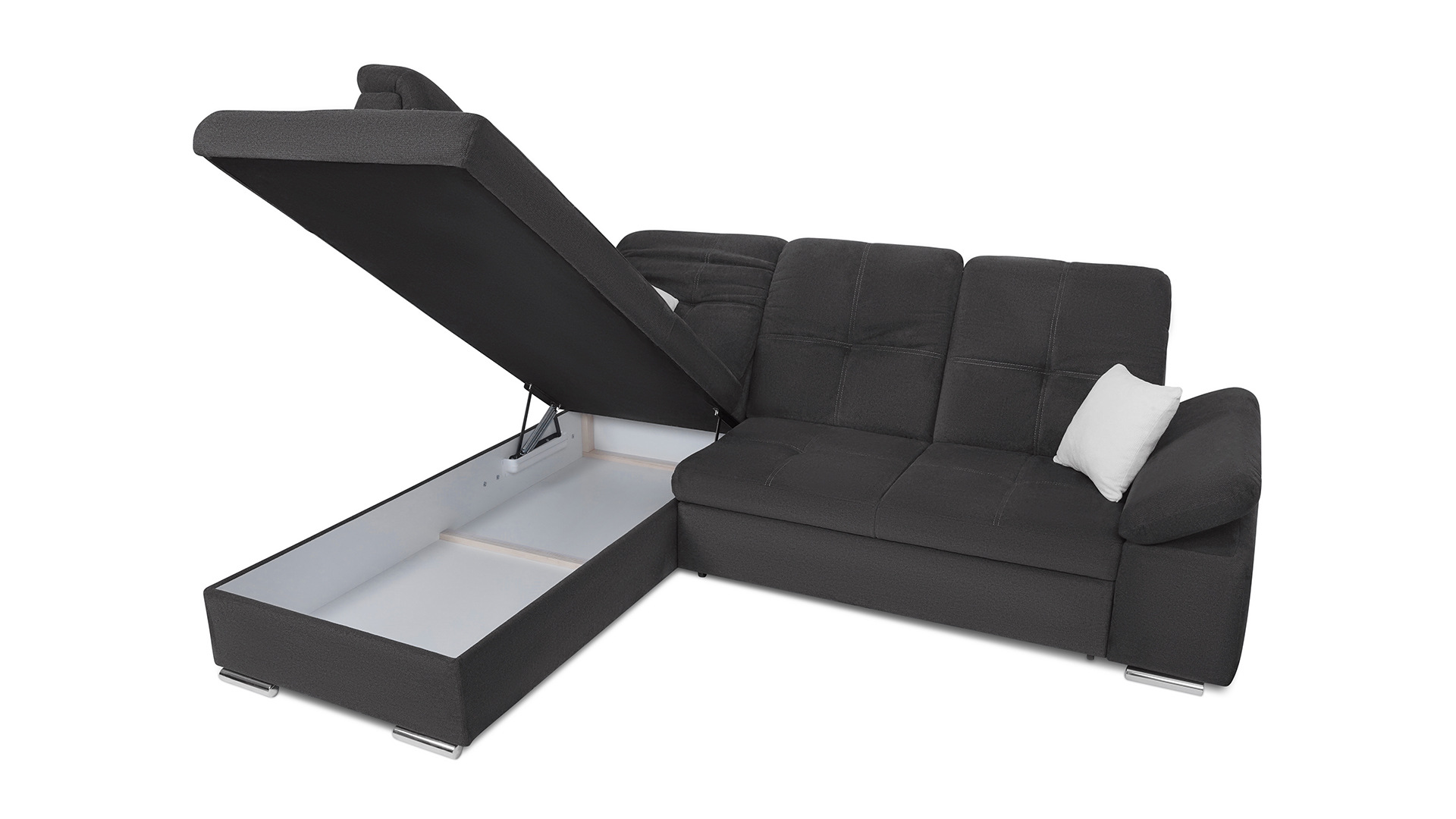 Mit wenigen Handgriffen lässt sich die Fjorda Sofaecke in eine bequeme Schlafcouch für Gäste verwandeln. Der geräumige Bettkasten schafft einen wertvollen Stauraum für Decken, Kissen oder andere Utensilien.