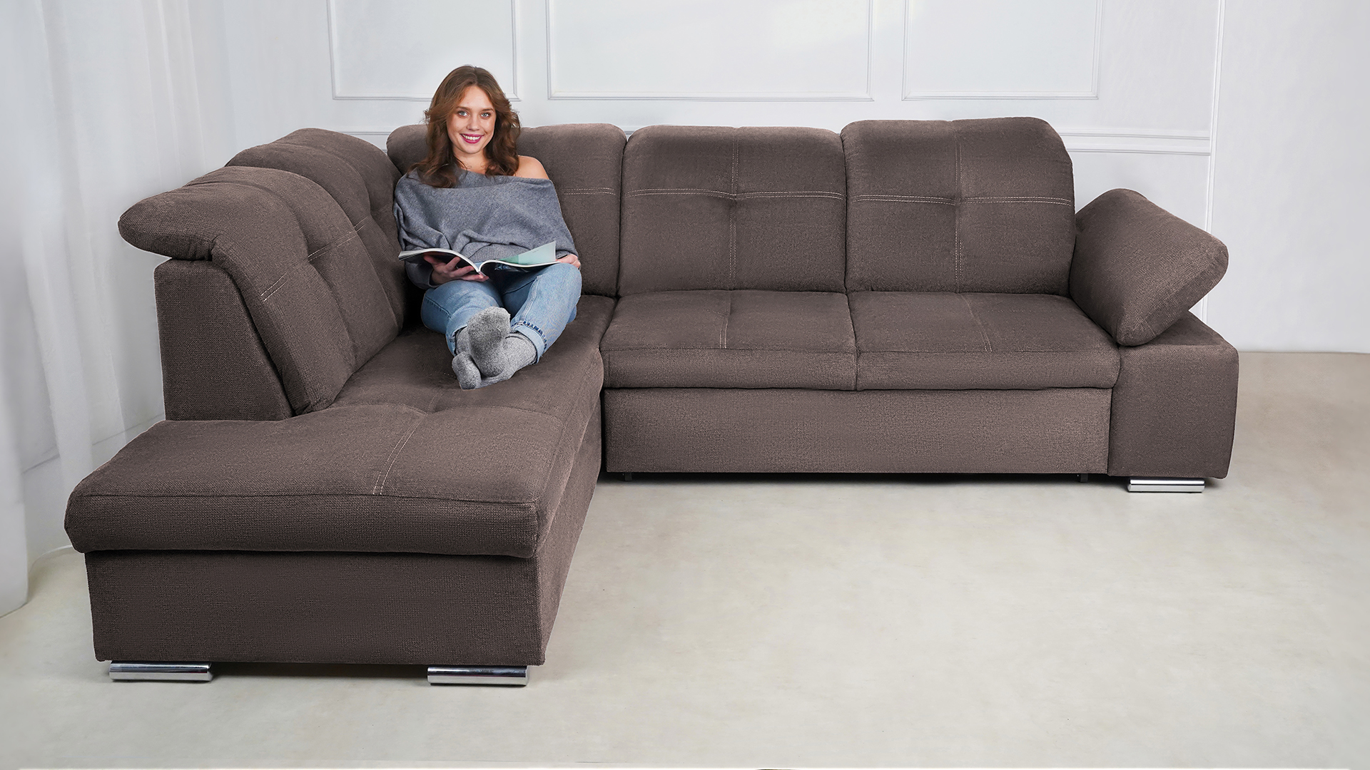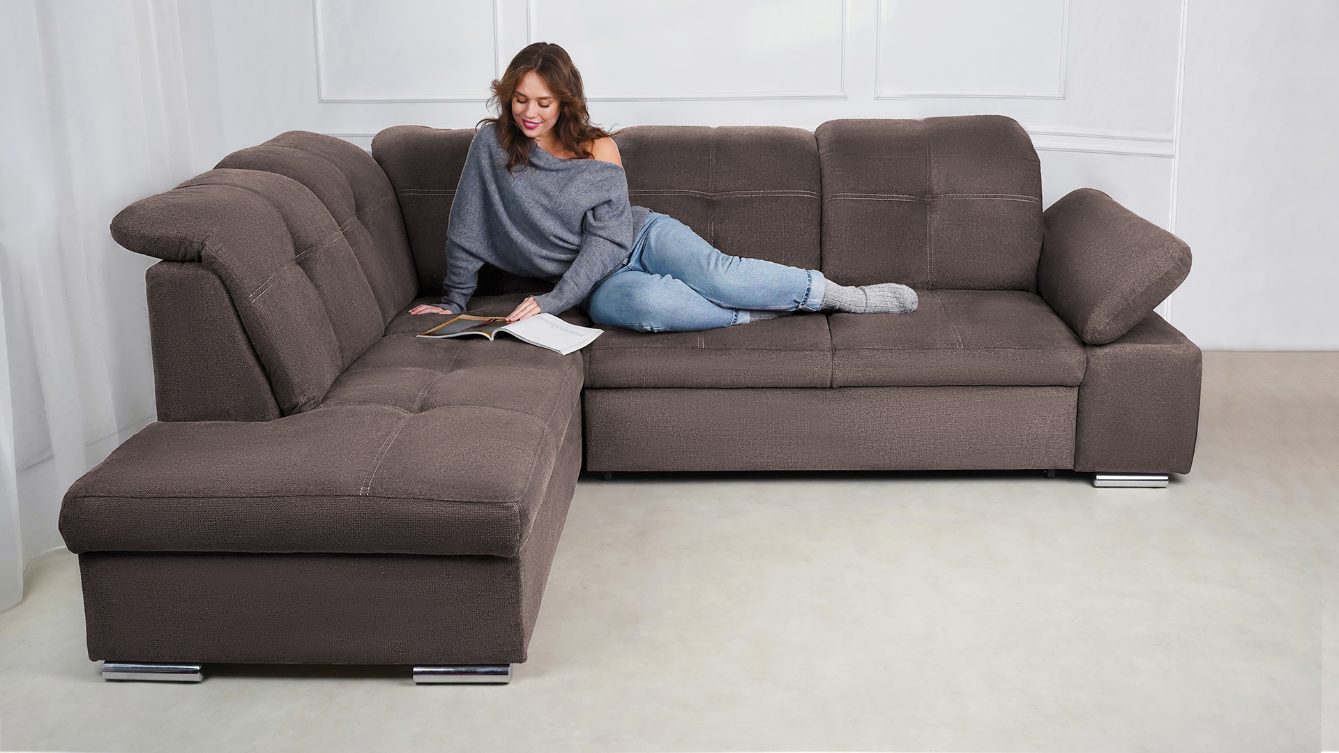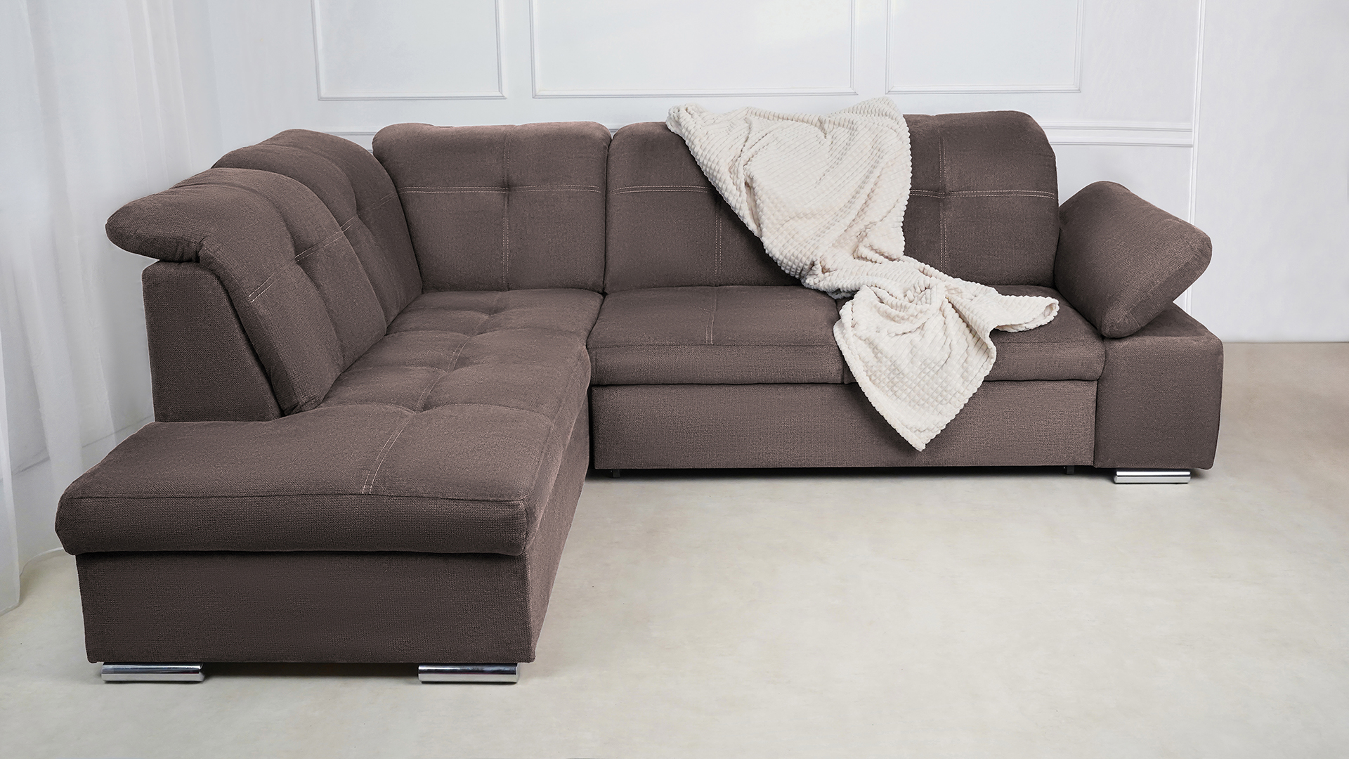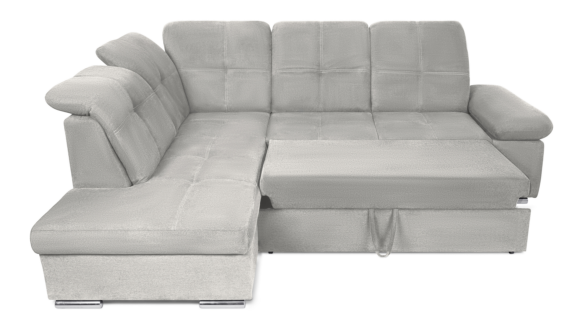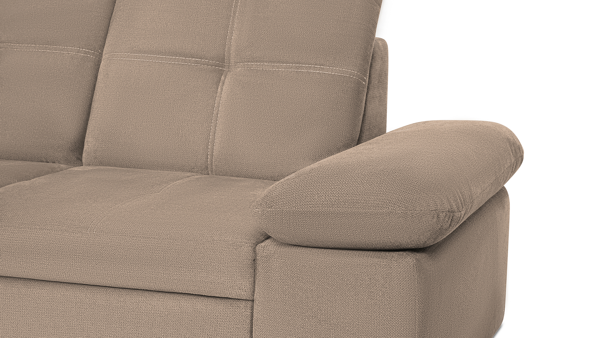Mit wenigen Handgriffen lässt sich die Fjorda Sofaecke in eine bequeme Schlafcouch für Gäste verwandeln. Der geräumige Bettkasten schafft einen wertvollen Stauraum für Decken, Kissen oder andere Utensilien.