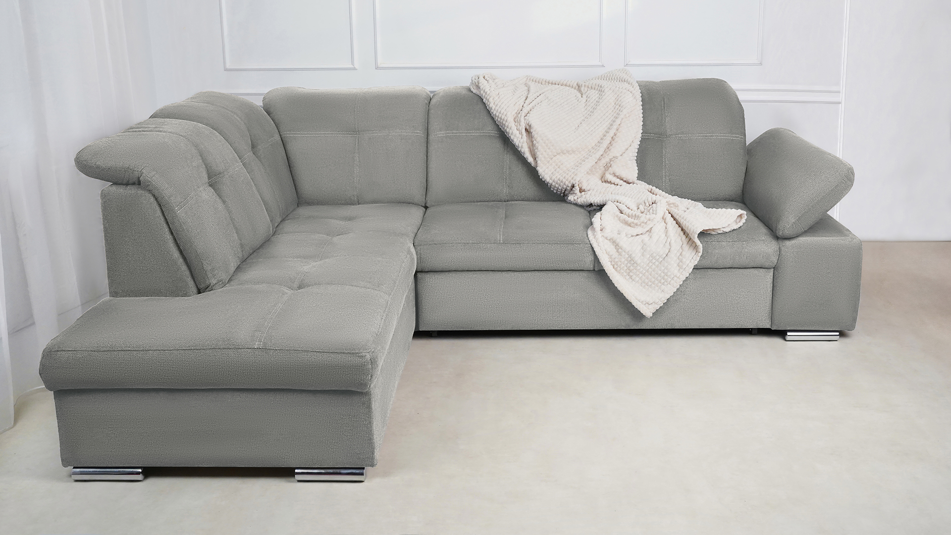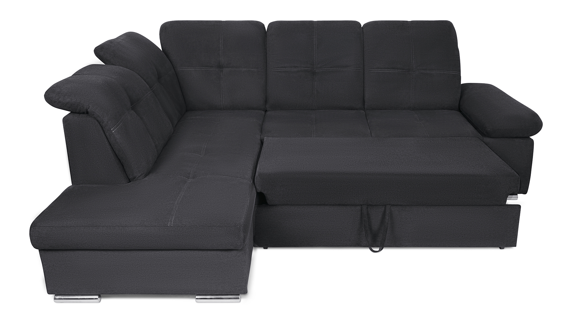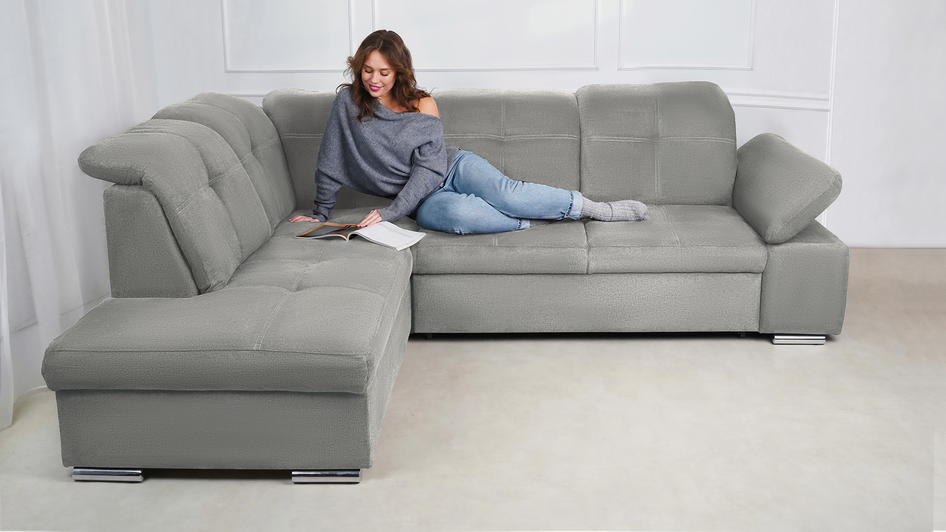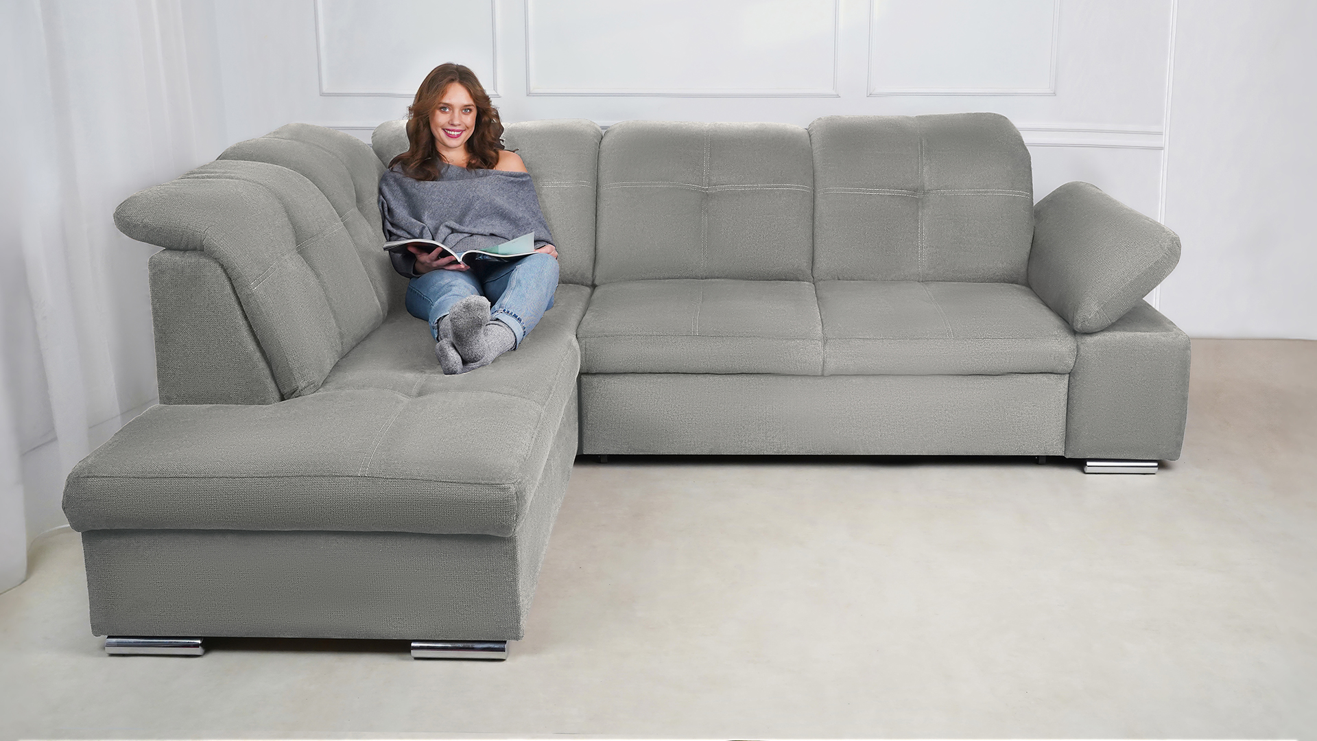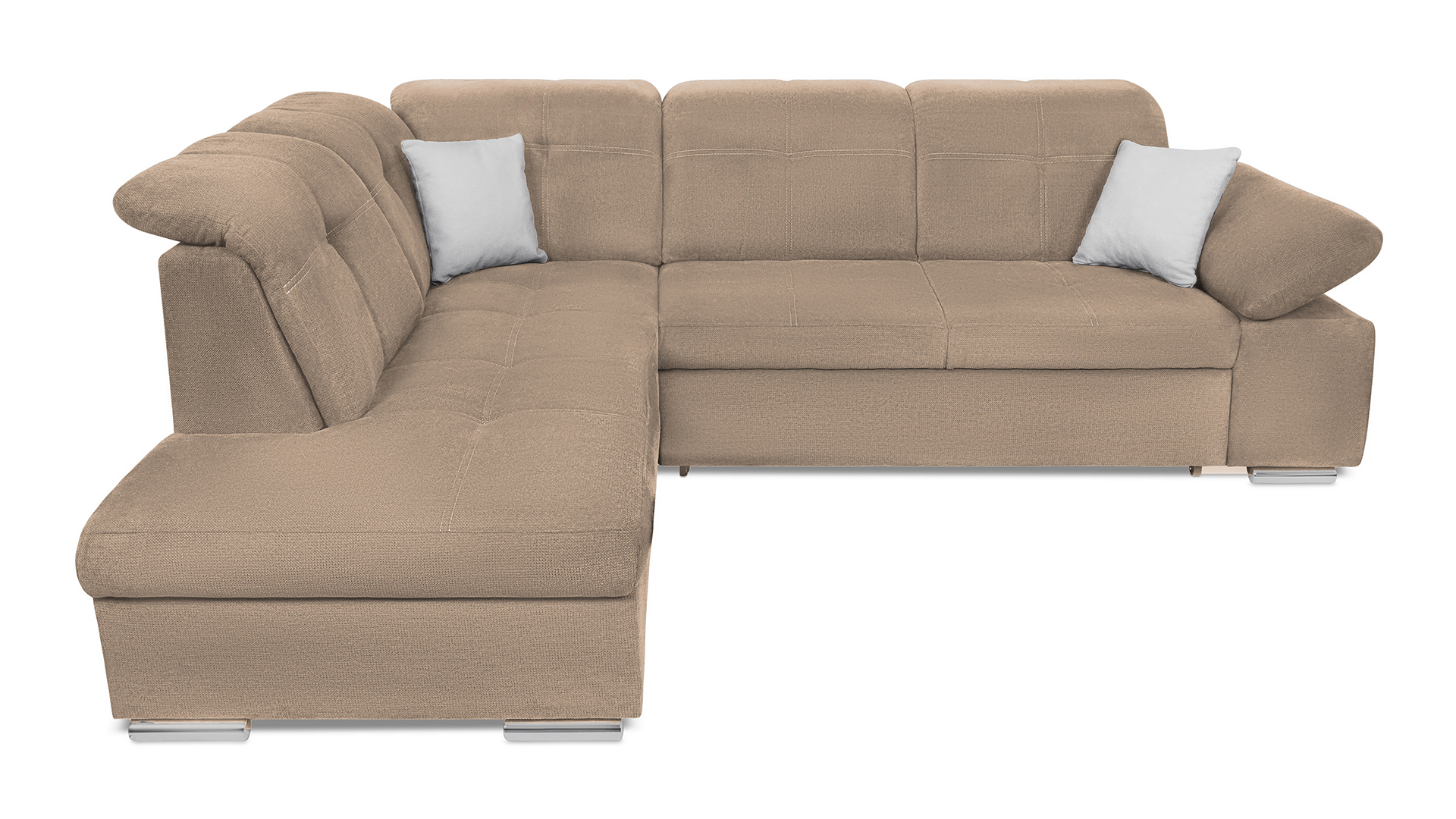 Mit wenigen Handgriffen lässt sich die Fjorda Sofaecke in eine bequeme Schlafcouch für Gäste verwandeln. Der geräumige Bettkasten schafft einen wertvollen Stauraum für Decken, Kissen oder andere Utensilien.